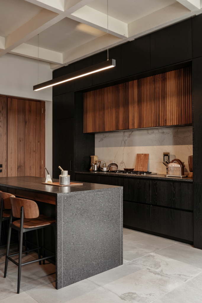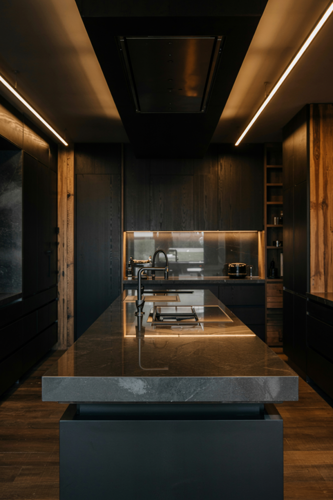 Dark tones are redefining luxury in kitchen interiors. Black matte cabinets, paired with a black granite top, create depth and bold contrast. Touches of wooden or blue hues soften the palette, while ambient lighting adds richness. As Interior Design Magazine notes, darker kitchens in 2026 feel intimate, elegant, and perfectly modern.