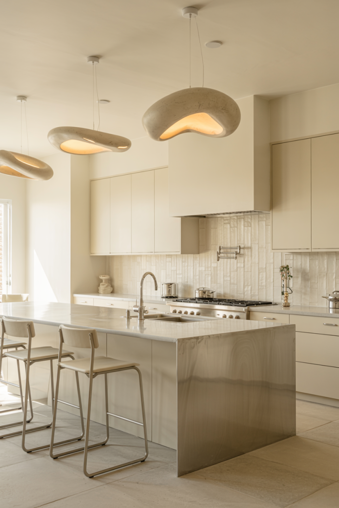 Lighting in 2026 kitchens becomes sculptural. From pendant clusters to curved LED strips, shaped fixtures act as statement pieces. A design modern kitchen can feel artistic when illuminated correctly — especially above an island or sink area. Pairing warm light with metallic finishes adds comfort and depth to evening gatherings.
