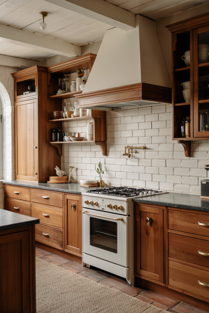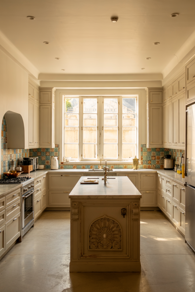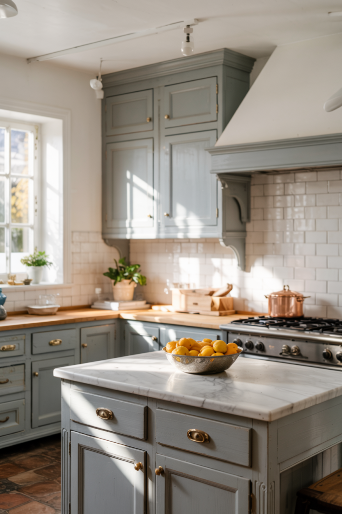In 2026, the French country aesthetic makes a refined comeback. Combining white, blue, and wooden finishes, this look blends romance and functionality. Delicate curves, open shelves, and a window view complete the scene. The result feels welcoming — a reminder that warmth and charm still define true design modern comfort.