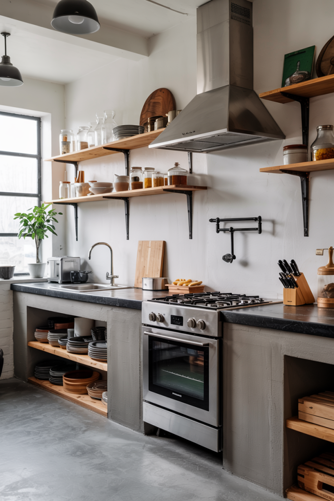 Industrial style continues its rise in 2026 — but now it’s softer, more livable. A design modern luxury interpretation blends exposed metal frames, concrete countertops, and black granite top finishes with warm lighting and wooden shelving. The result is a kitchen that feels both edgy and inviting — perfect for creative homeowners who love raw textures with refined details.