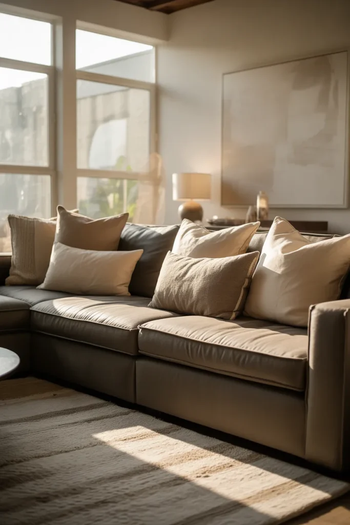 A practical insight for this look is to prioritize seating comfort rather than decorative pieces first. Comfortable, deep sofas with supportive cushions improve quality of life, while decor can stay minimal. This style helps the room adapt to to changes over the years. Throw pillows, cozy throws, or a new rug help change the look without replacing large furniture pieces.