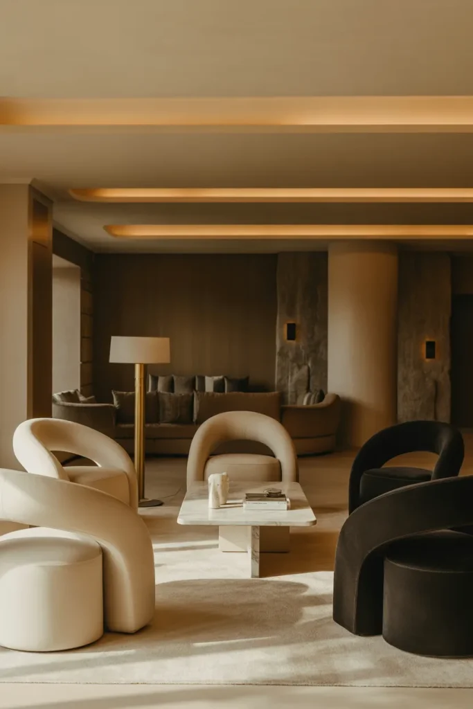 This living room captures the balance of comfort and visual statement perfectly. The rich materials, sculptural forms, and controlled contrast bring in the drama without going overboard. It fits naturally into the Luxury, Modern luxury, and Ideas focused homes where the quality of the materials is more important than the quantity of elements.