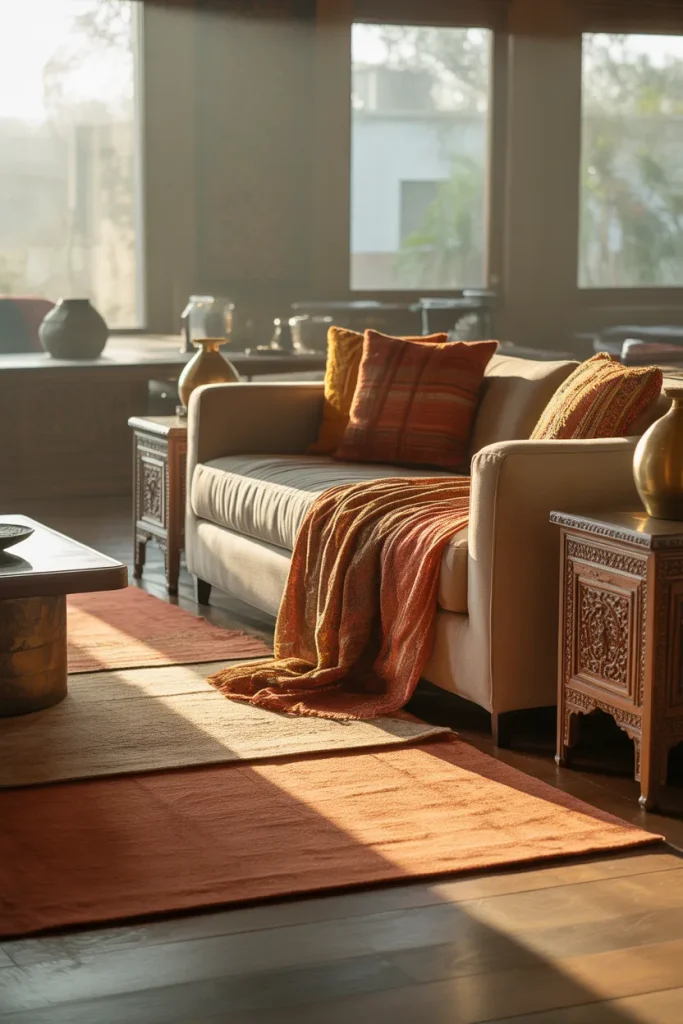 A common mistake is overloading the room with patterns. The best results come from choosing one or two statement elements, such as a rug or carved coffee table, and keeping the rest calm. This balance preserves warmth without visual chaos.