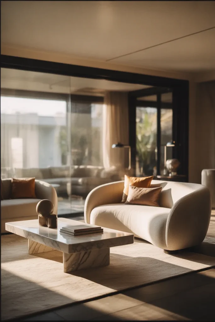 This shows that minimal does not equate to feeling cold. Clean lines are paired with soft curves, warm neutrals, and subtle textures. The end result is a refined and approachable feel, combining Minimalist, Elegant, and Minimal styles into a balanced and calm living room design that works for apartments and larger homes.