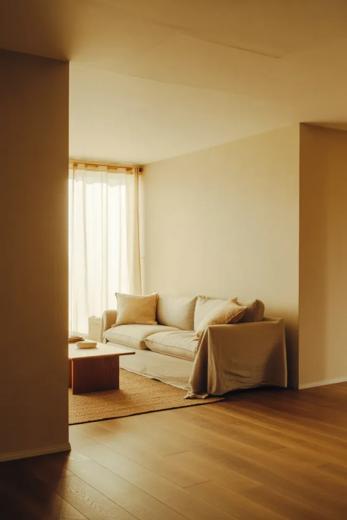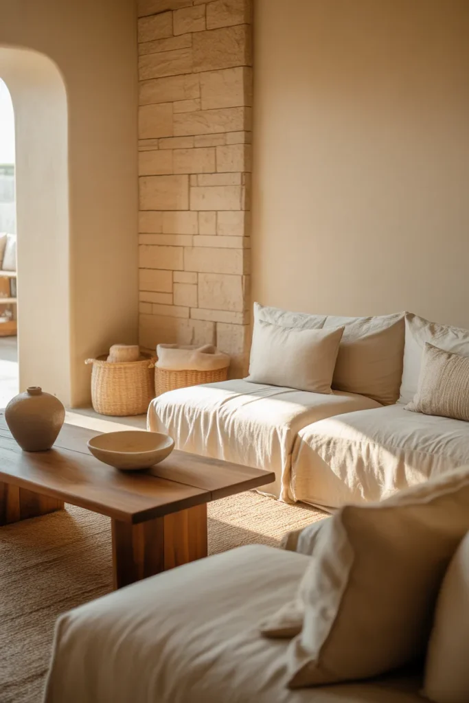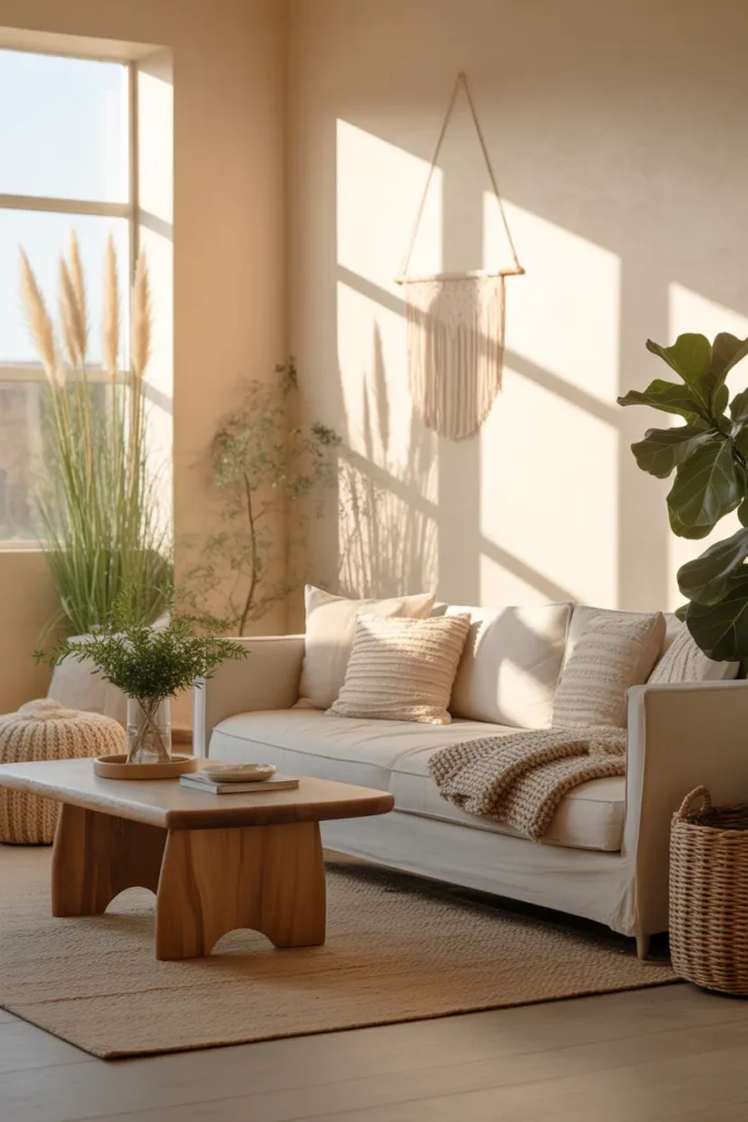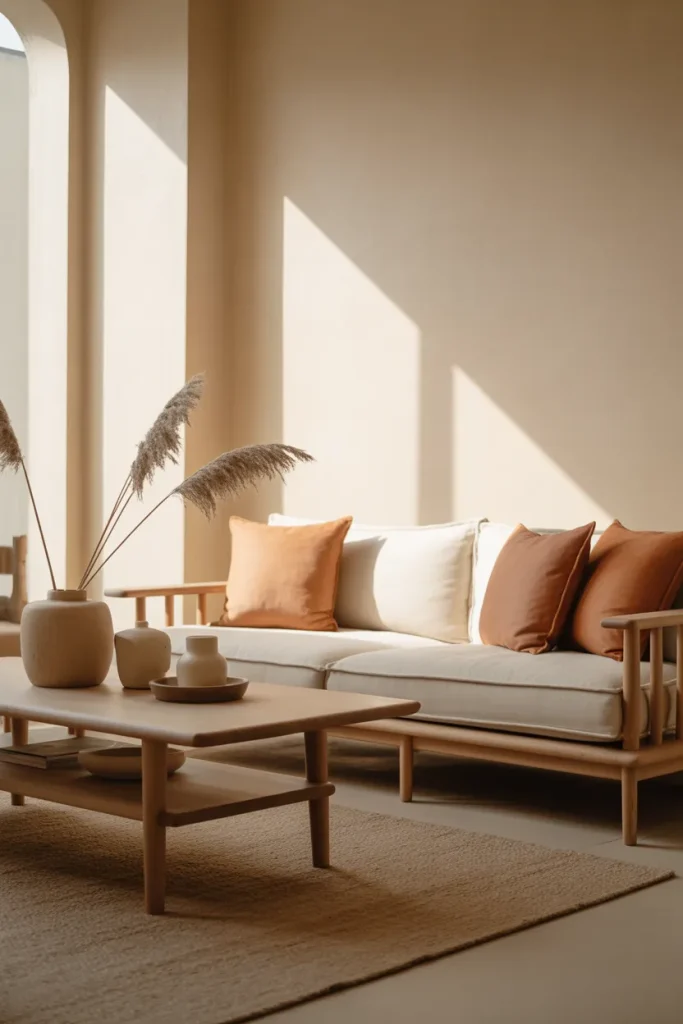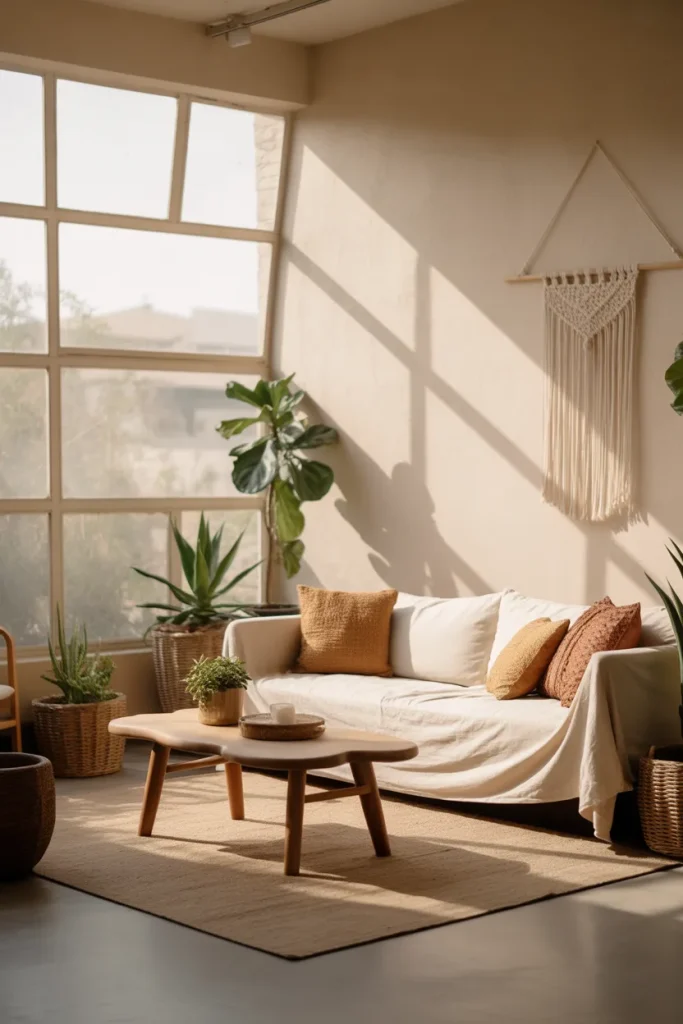 This look softens minimalism through texture and warmth. A cozy boho minimalist living room blends relaxed materials with an uncluttered layout, combining bohemian charm and restraint. Natural fabrics, low seating, and warm tones make the space feel lived-in yet intentional.