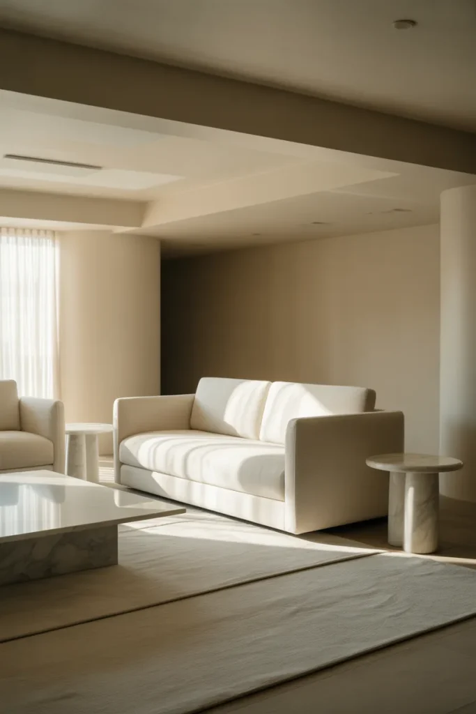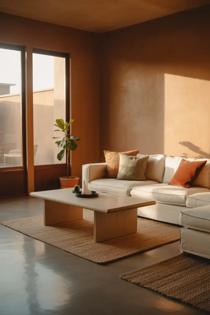 Earthy neutrals provide balanced warmth to minimalist spaces. Mixing earthy shades with a soft neutral palette, the living area offers a serene and nature-connected experience. The color palette is kept soft to let texture and illumination create the ambiance.