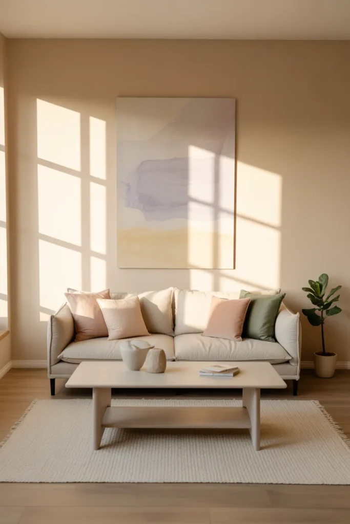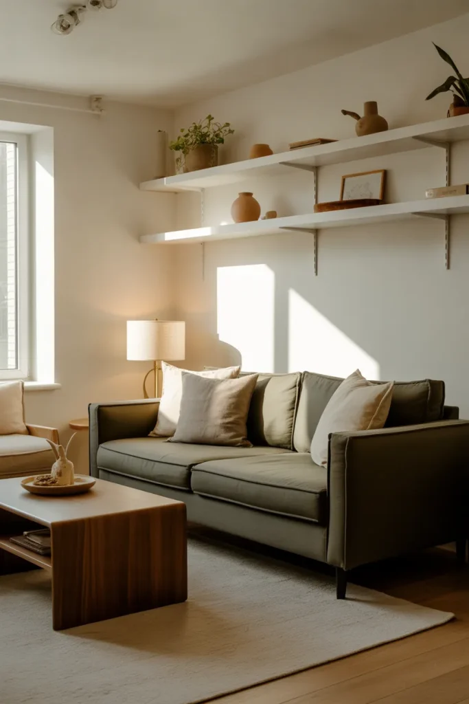 Color is quietly re-entering minimalist living rooms in thoughtful ways. Instead of bold patterns, designers use controlled accents to create colorful moments within a clean design. A muted sofa, a single art piece, or soft-toned accessories add personality while keeping the room visually calm and uncluttered.
