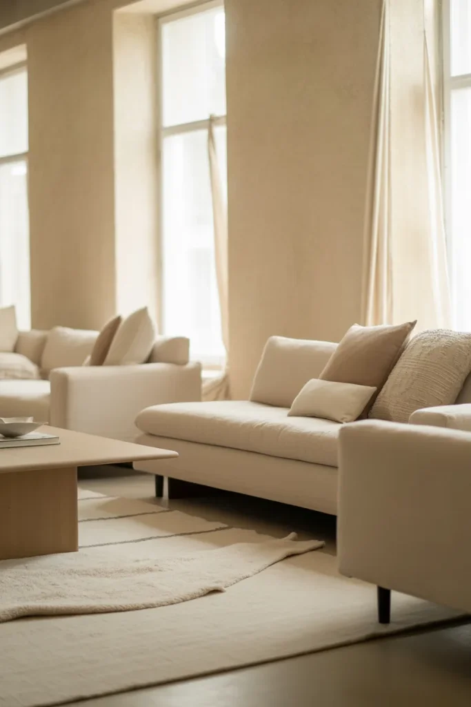 Gentle contrast rather than strong statements is the foundation of this minimalist design. Light walls and slightly darker furniture provide a visual contrast, creating rhythm without overwhelming the space. The room feels intentional with modern furniture and minimal decor without drawing attention to a specific element. The balance is modern and classic at the same time.