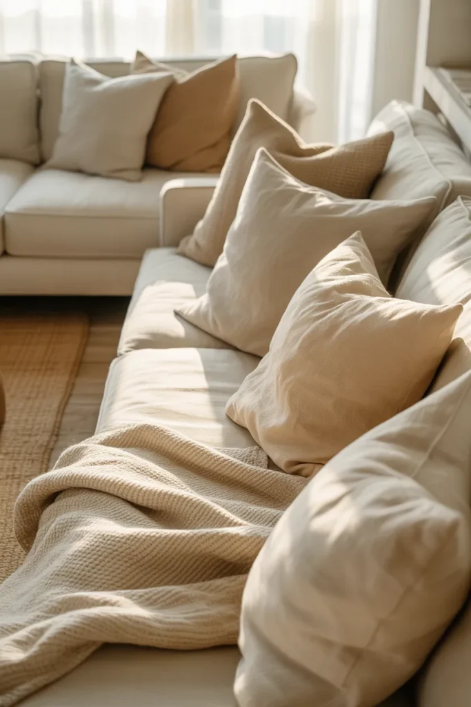 In cohesive minimalist designs, textiles perform much of the work. A few carefully selected textiles provide warmth and a clean, tidy layout. This design blends thoughtful details and cozy comfort, using throws, cushions, and rugs to soften the minimalist lines and avoid creating visual clutter.
