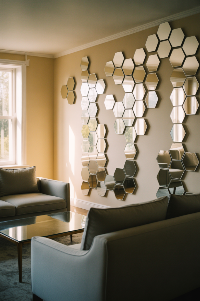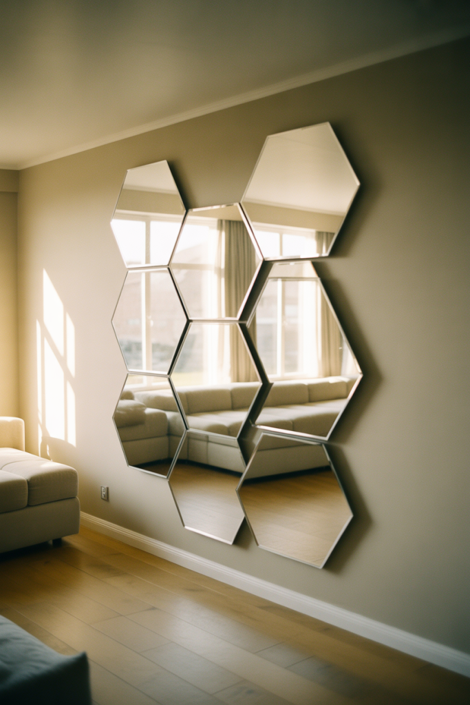 A hexagon mirror gallery wall instantly adds rhythm and movement to a space without feeling heavy. This approach to mirror wall decor 2026 works beautifully in modern homes that lean toward clean lines but still want visual interest. Arranged in a loose grid or organic cluster, Hexagon shapes echo architectural geometry, while a subtle Honeycomb layout keeps the wall dynamic. It’s especially effective in transitional interiors where balance matters.