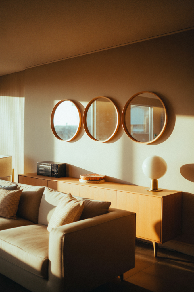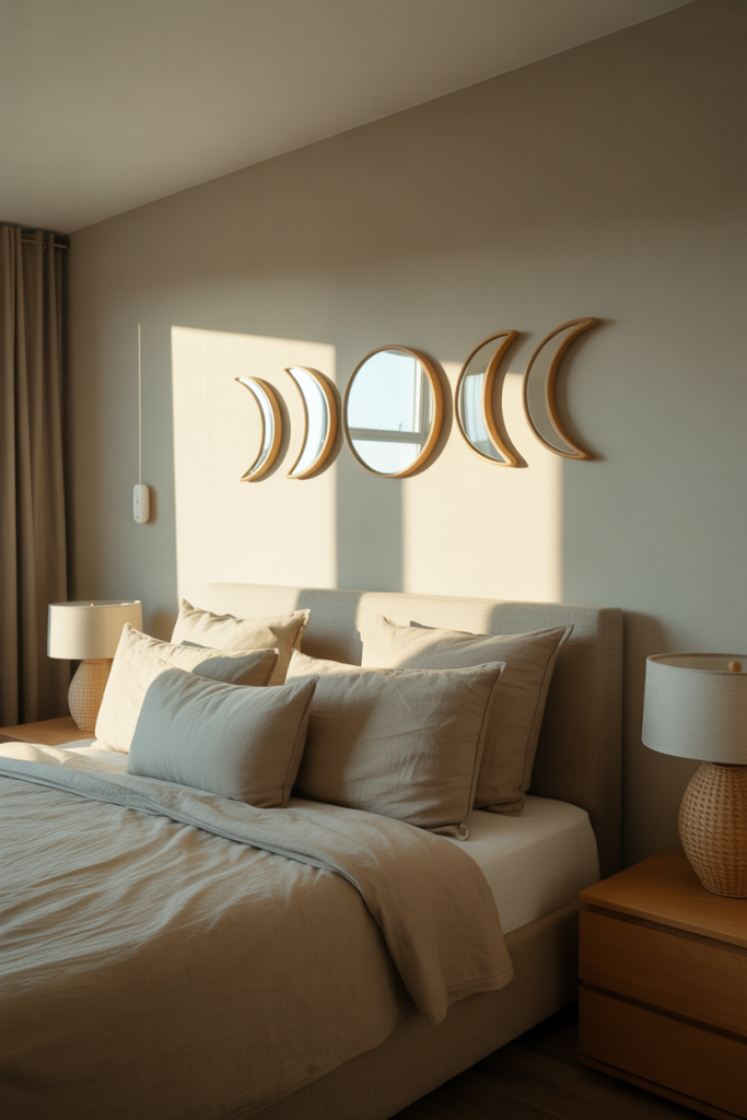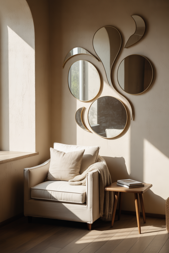Mixing moon-inspired mirrors with simple circles adds softness and personality. This mirror wall decor 2026 idea blends Moon elements with Circle shapes for a relaxed, almost meditative feel. It works beautifully in reading corners or quiet lounges.