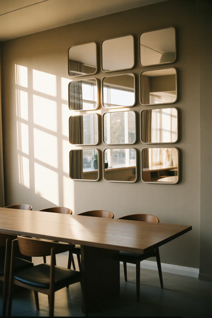 This 2026 design idea incorporates a wall of coordinating square mirrors that, while reflecting, create an interesting focal point. This wall decoration also incorporates repetition, paralleling the squared shapes of dining tables and cabinetry. This design provides a perfect balance of simplicity and sophistication, making it an excellent choice for a design-savvy homeowners looking to make a big impact via neutral design choices.
