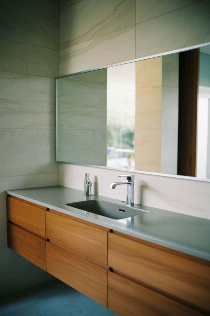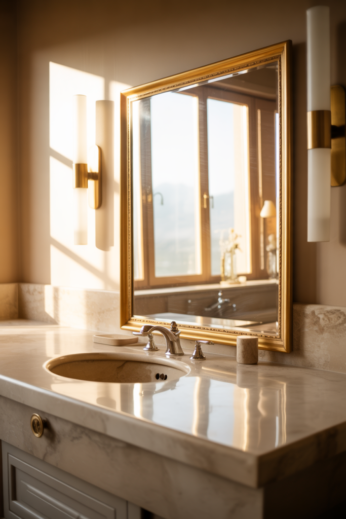 Practical insight: installing the mirror slightly lower than eye level helps avoid harsh overhead reflections from ceiling lights. Designers often recommend pairing it with wall-mounted lighting to keep the look balanced and glare-free.