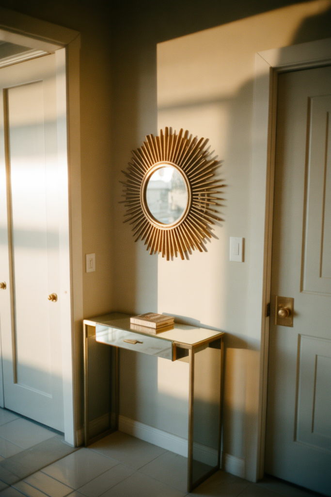 A round mirror with radiating details brings warmth and personality into an entrance, setting the tone the moment you walk in. This mirror wall decor 2026 idea draws from classic sun motifs while staying modern through simplified forms. A Round shape paired with subtle Sun elements and a soft Gold finish reflects light gently, making even narrow entryways feel welcoming and intentional.