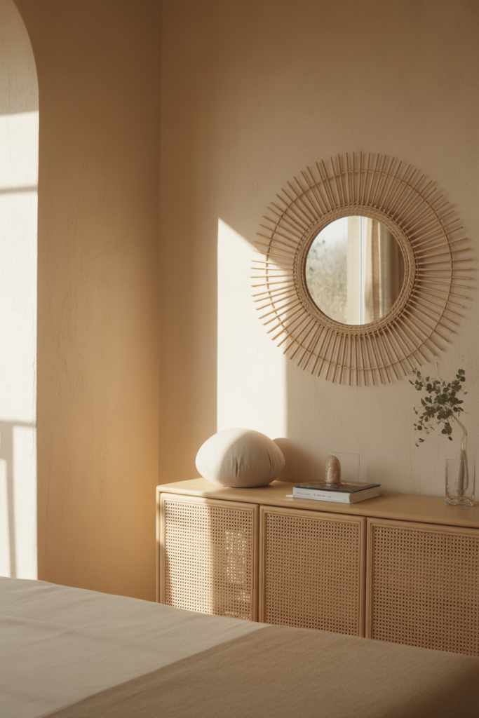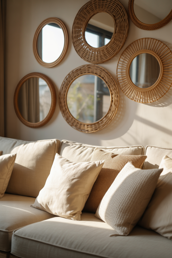 A rattan mirror wall brings warmth and texture into living spaces that might otherwise feel too polished. This mirror wall decor 2026 idea combines Rattan frames with relaxed Ideas rooted in comfort and approachability. The natural material softens reflections and adds visual depth without dominating the room.