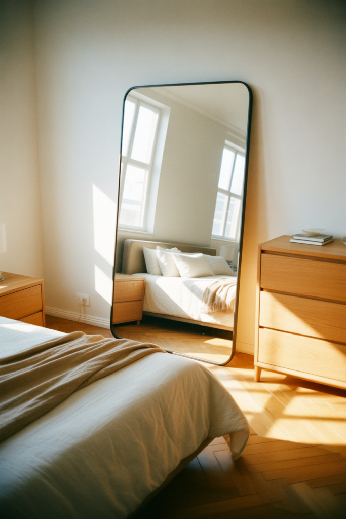 Using a full rectangle mirror as a wall accent is a confident move that pays off in both style and function. This mirror wall decor 2026 idea relies on simplicity: a large Rectangle mirror placed intentionally can visually double a room. It works particularly well in minimalist interiors where restraint matters and every element needs to earn its place.