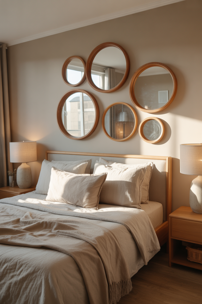 Homeowners often choose this style after realizing a single mirror feels too formal in a bedroom. A cluster softens the mood. Keeping all frames within the same wood tone helps maintain cohesion while still allowing variety in shape and size.