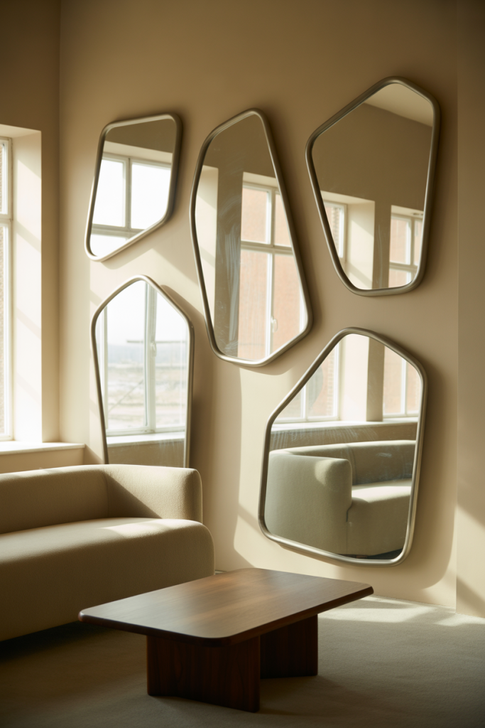 A square mirror grid offers a structured yet playful approach to mirror wall decor 2026. Using multiple Square mirrors in a clean layout feels graphic without becoming cold. This is a popular Diy solution for renters and first-time homeowners who want impact without permanent changes. The repetition creates visual order while reflecting light evenly across the wall.