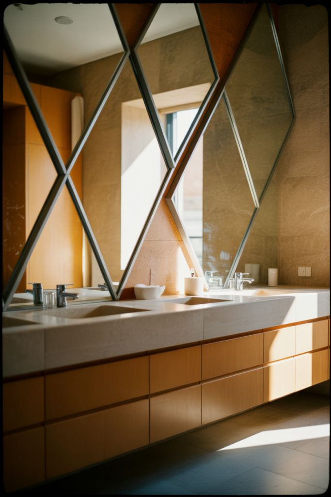 A diamond-shaped mirror layout brings subtle drama into bathroom design. This mirror wall decor 2026 idea combines Diamond forms with functional needs, creating visual interest without clutter. It’s especially striking in powder rooms where design can take a bolder turn than in shared spaces.