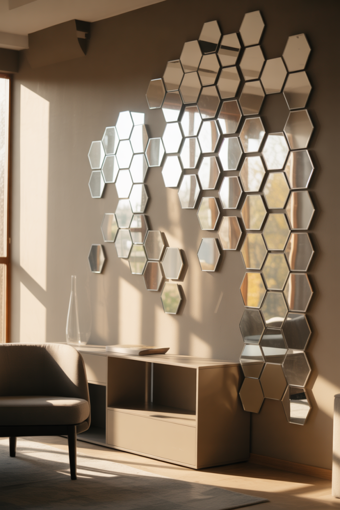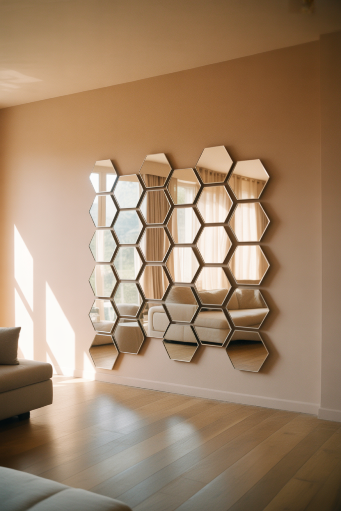 A hexagon mirror gallery wall instantly adds rhythm and movement to a space without feeling heavy. This approach to mirror wall decor 2026 works beautifully in modern homes that lean toward clean lines but still want visual interest. Arranged in a loose grid or organic cluster, Hexagon shapes echo architectural geometry, while a subtle Honeycomb layout keeps the wall dynamic. It’s especially effective in transitional interiors where balance matters.
