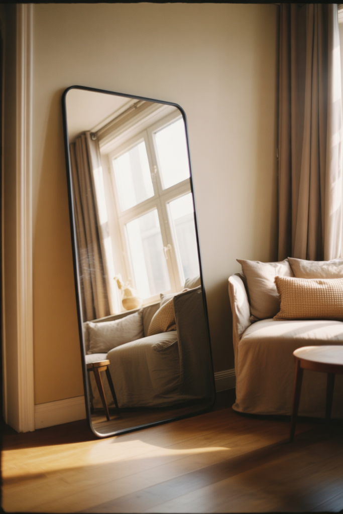 Using a full rectangle mirror as a wall accent is a confident move that pays off in both style and function. This mirror wall decor 2026 idea relies on simplicity: a large Rectangle mirror placed intentionally can visually double a room. It works particularly well in minimalist interiors where restraint matters and every element needs to earn its place.
