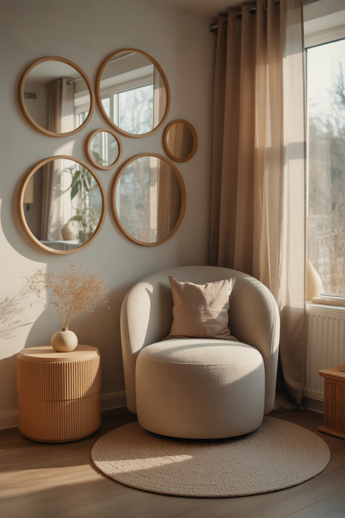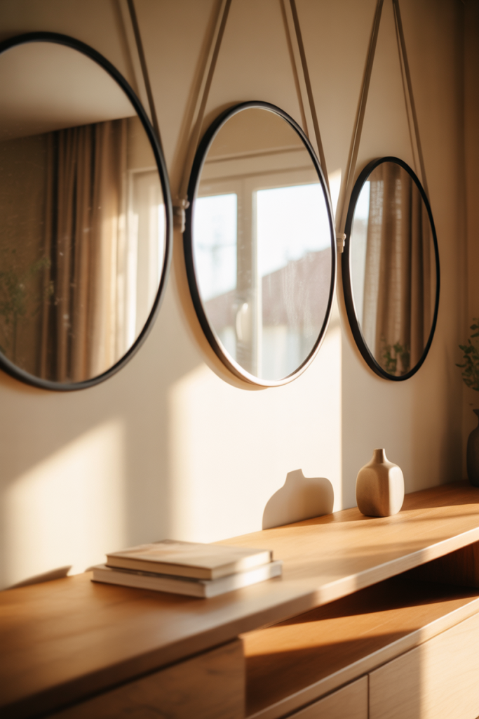 Mixing moon-inspired mirrors with simple circles adds softness and personality. This mirror wall decor 2026 idea blends Moon elements with Circle shapes for a relaxed, almost meditative feel. It works beautifully in reading corners or quiet lounges.