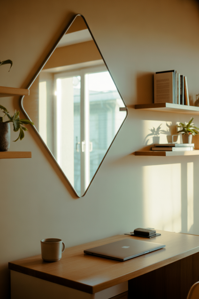 Uses a diamond-shaped mirror accent to incorporate lines and shapes without a heavy feel. For 2026 decor with mirrors, an individual diamond or collection of smaller ones is ideal for more concentrated environments, particularly home offices. Angled lines provide interest while maintaining clean and functional designs, especially for work-at-home interiors.