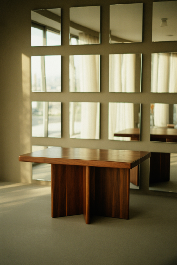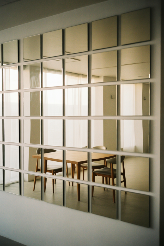 A square mirror grid offers a structured yet playful approach to mirror wall decor 2026. Using multiple Square mirrors in a clean layout feels graphic without becoming cold. This is a popular Diy solution for renters and first-time homeowners who want impact without permanent changes. The repetition creates visual order while reflecting light evenly across the wall.