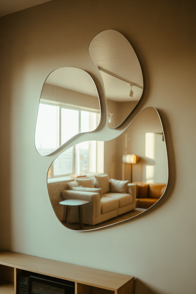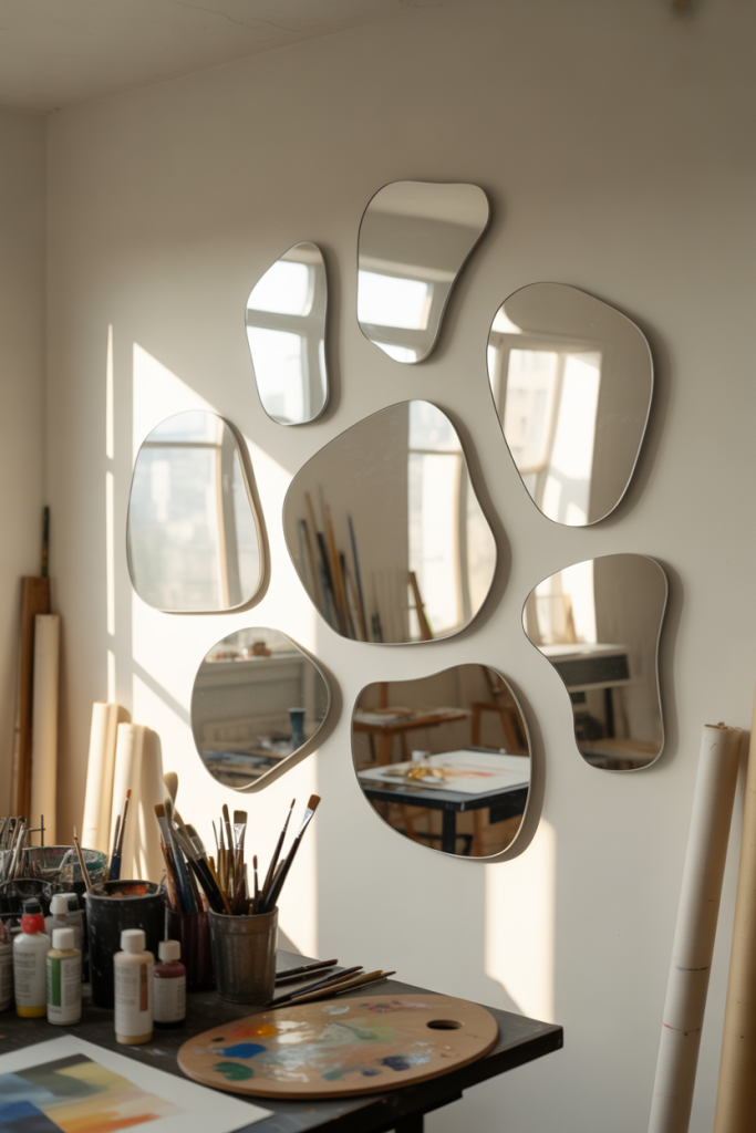 Creative rooms benefit from playful design choices, and acrylic mirrors deliver exactly that. This mirror wall decor 2026 idea uses Acrylic surfaces in Abstract forms to reflect light unpredictably, turning walls into functional art. It’s ideal for studios or hobby rooms where expression matters.