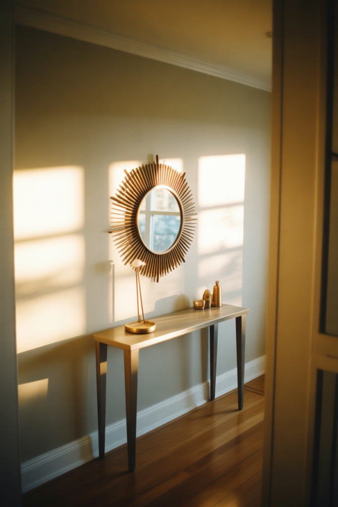 A round mirror with radiating details brings warmth and personality into an entrance, setting the tone the moment you walk in. This mirror wall decor 2026 idea draws from classic sun motifs while staying modern through simplified forms. A Round shape paired with subtle Sun elements and a soft Gold finish reflects light gently, making even narrow entryways feel welcoming and intentional.