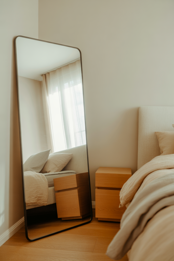 A micro anecdote many homeowners share is how this simple change makes mornings feel calmer. The natural frame softens reflections, making the bedroom feel less rushed and more grounded.