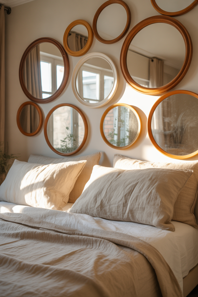 Homeowners often choose this style after realizing a single mirror feels too formal in a bedroom. A cluster softens the mood. Keeping all frames within the same wood tone helps maintain cohesion while still allowing variety in shape and size.