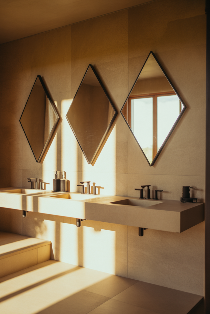 A diamond-shaped mirror layout brings subtle drama into bathroom design. This mirror wall decor 2026 idea combines Diamond forms with functional needs, creating visual interest without clutter. It’s especially striking in powder rooms where design can take a bolder turn than in shared spaces.