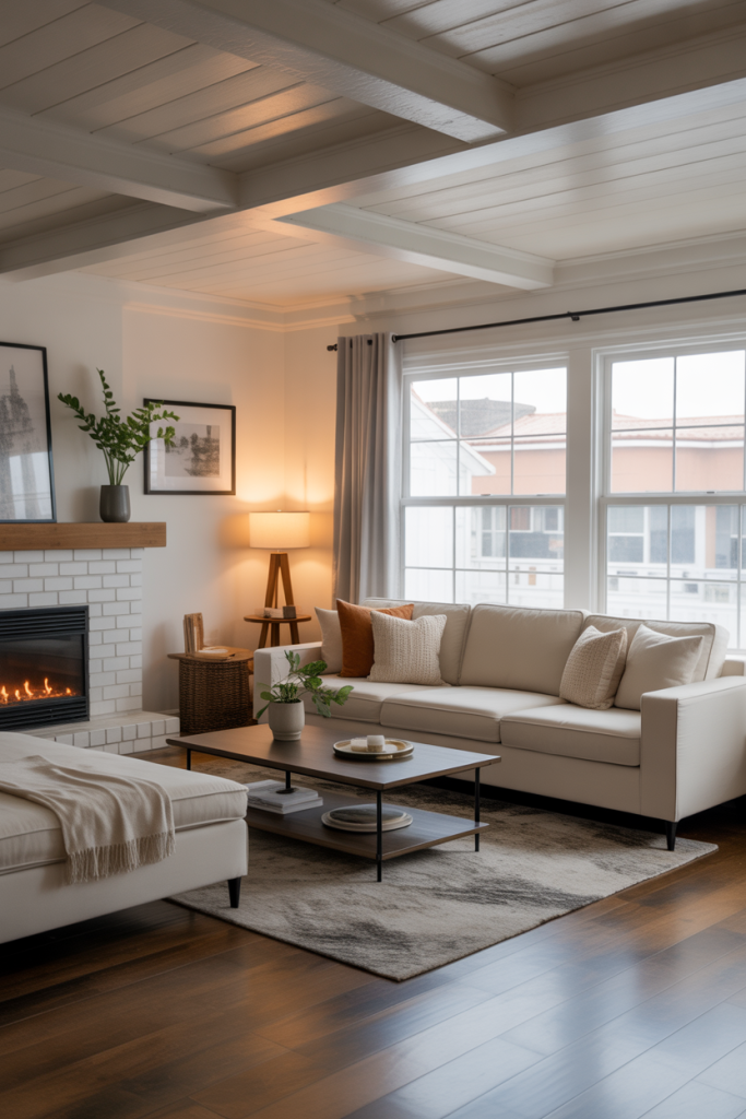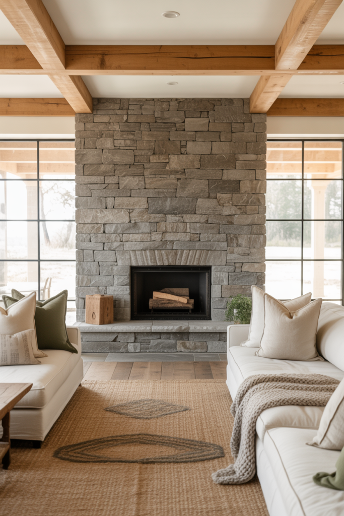 A stone-clad fireplace makes for a cozy modern farmhouse room, especially when surrounded by rustic beams and layered neutrals that inspire something new. One designer friend once mentioned that nothing grounds a space like natural stone, and she was right—families always seem to gravitate toward it instinctively. Add a soft rug, a relaxed layout, and simple greenery to keep it feeling timeless in 2026.