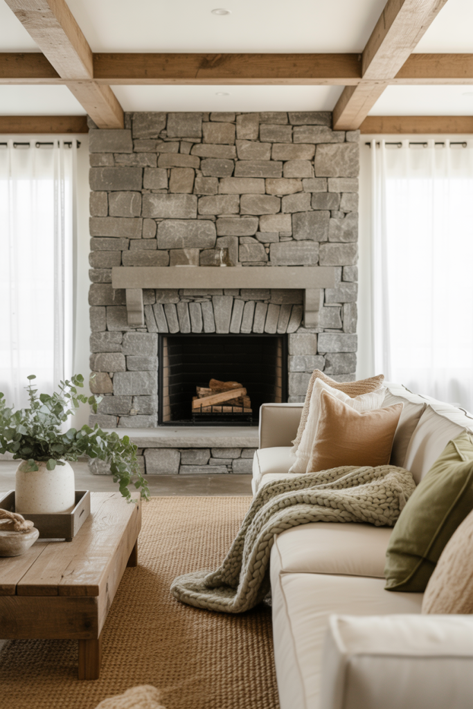 11. Stone Fireplace Warmth with Cozy Textures
