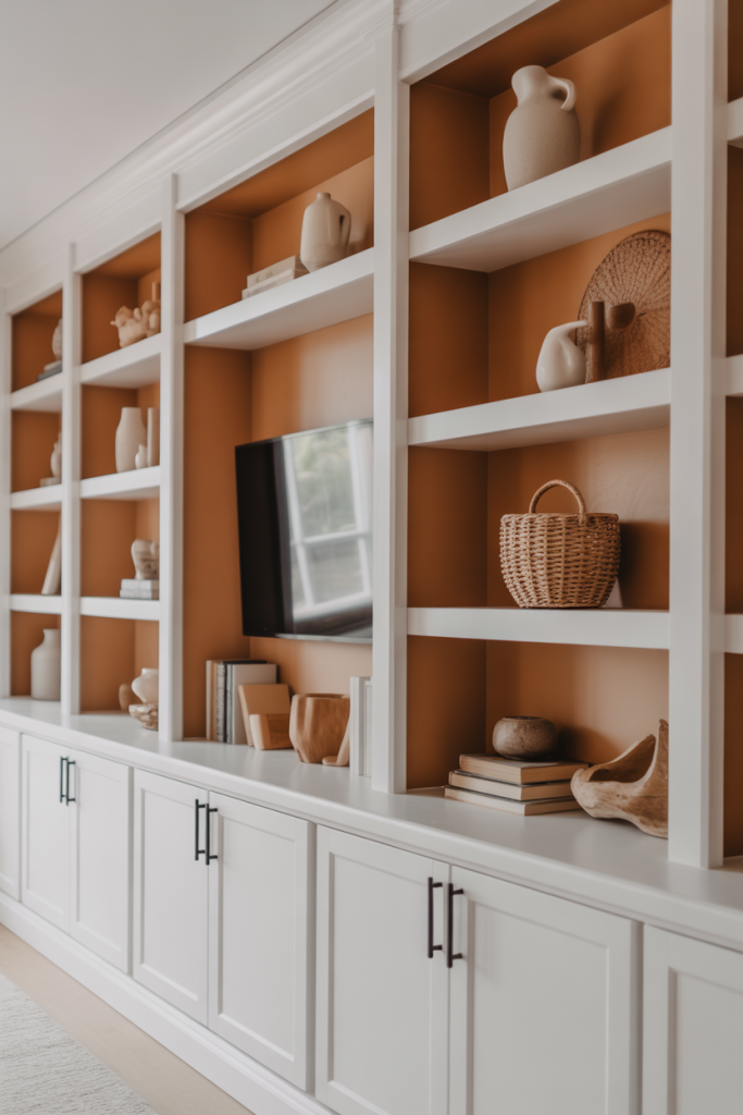 Many homeowners opt for custom built-ins painted in warm paint color palettes such as cream, white, or muted clay. When a neighbor built in shelving in her small apartment, the room felt instantly intentional instead of crowded. Add woven baskets, meaningful wall décor, and black cabinet hardware to give it that modern farmhouse edge that’s polished yet relaxed.