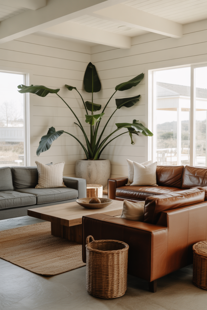 Plants used as living sculpture enhance organic softness in modern farmhouse style—especially when a brown couch or light-toned furnishings are brought in. I once helped place a fiddle-leaf fig beside my friend’s gray couch, and the room instantly brightened. Greenery marries modern lines with rustic warmth and works beautifully within both large and small space settings.