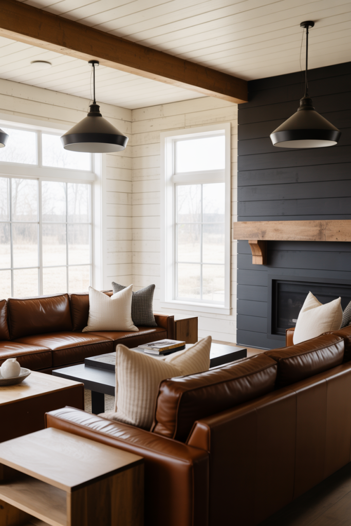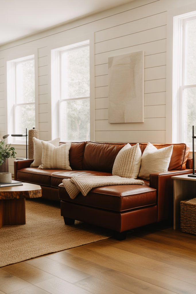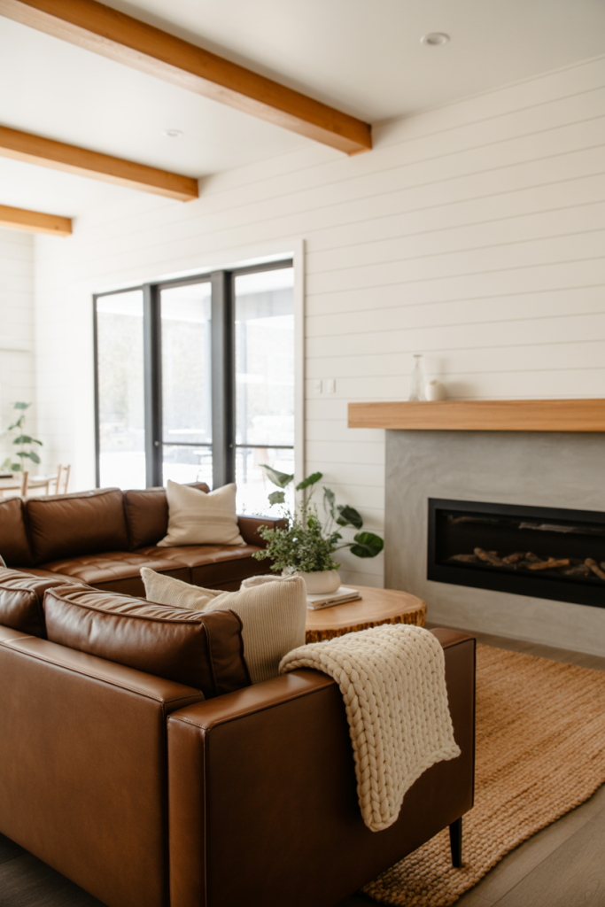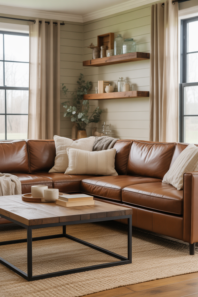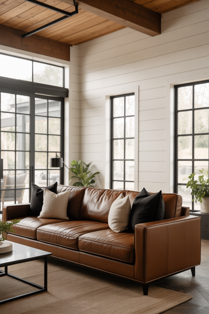 5. Brown Couch Warmth in Modern Farmhouse Spaces