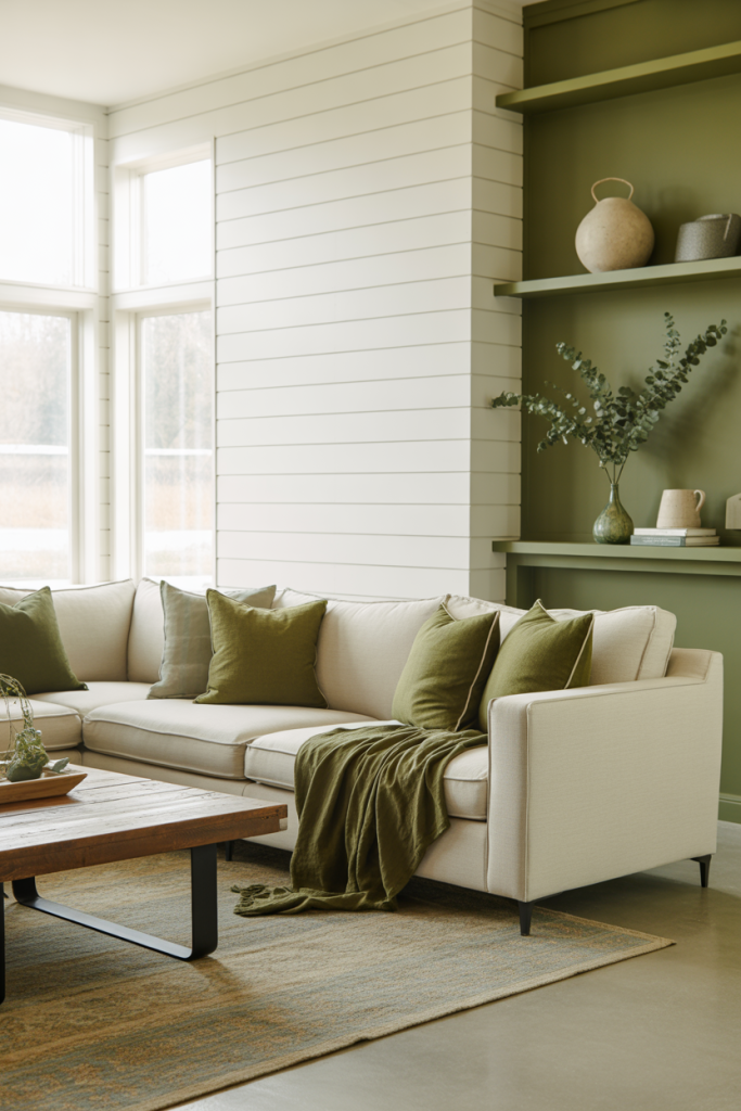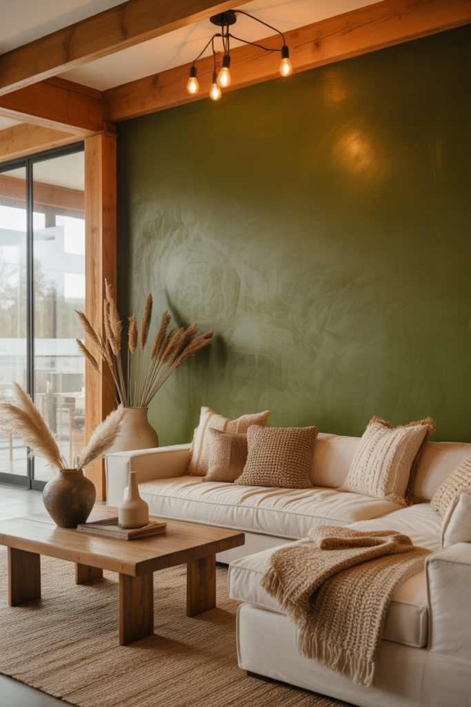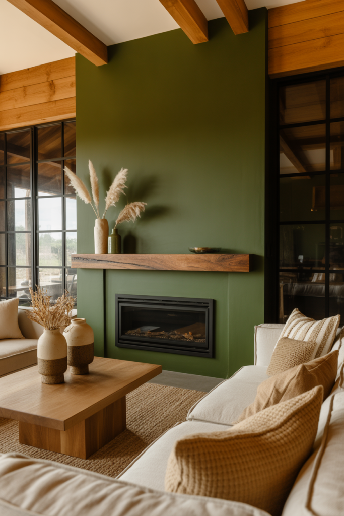 Deep sage or olive paint colors create a moody, enveloping effect that feels grounded yet stylish. One homeowner shared with me that painting just one wall behind her bookcase transformed her entire room’s energy. Along with warm woods, soft lighting, and textured baskets, the idea squarely fits into the 2026 modern farmhouse palette.