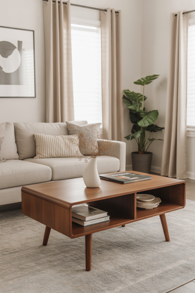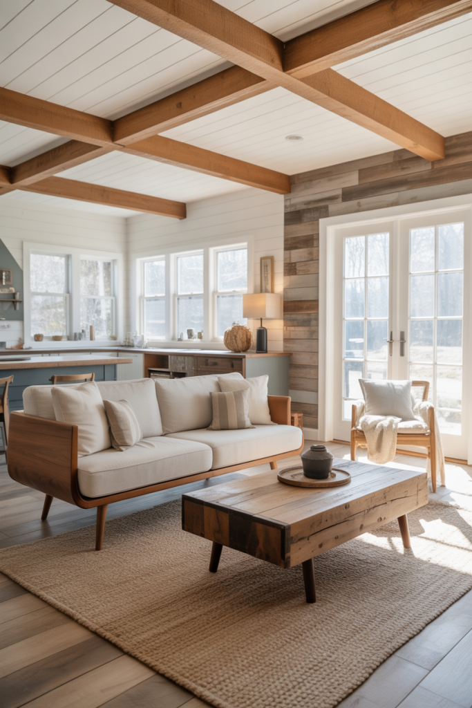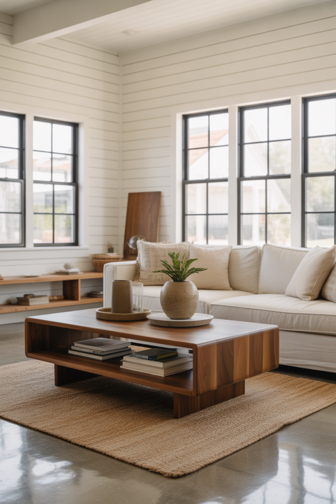 A mid-century coffee table with slim legs helps open up a room, especially if you’re working with a small space or a heavier sofa. I once swapped a bulky farmhouse table for a sleeker walnut piece, and the room instantly breathed easier. Mixing eras keeps the farmhouse look fresh without drifting into overly themed décor.
