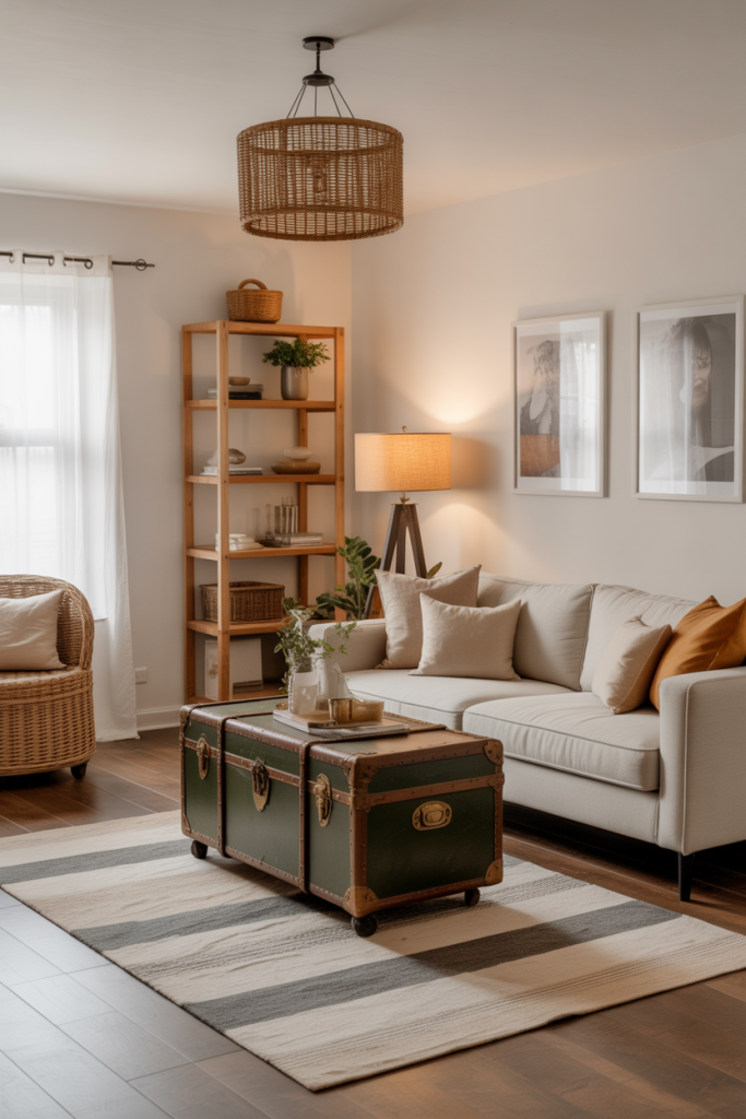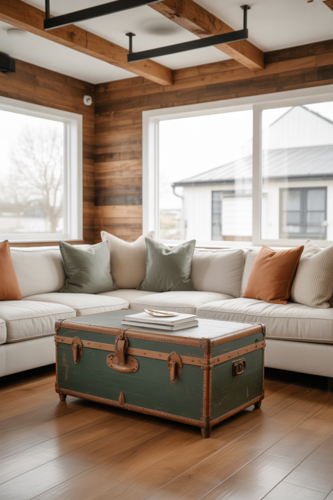 Vintage trunks were a source of functional furniture, charm, and storage, perfect for the farmhouse layout in tiny spaces. A couple I interviewed used an old traveling trunk as a coffee table, and overnight, the room got personality without losing function. Mixed with linen pillows, warm woods, and understated wall decor, the look blends nostalgia with 2026 modern practicality.