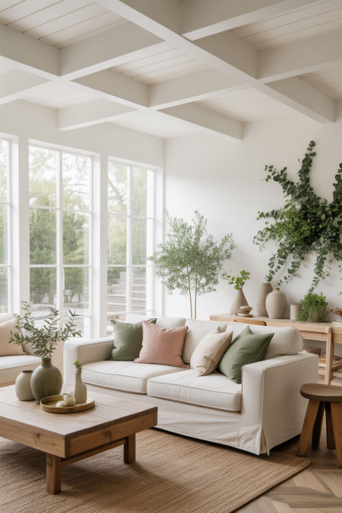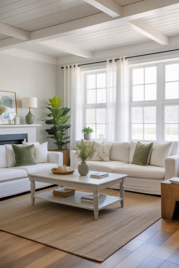 Adding green elements—sage cabinets, eucalyptus bundles, or soft olive throws—brings a fresh airiness to a living room. Joanna Gaines often highlights how color can transform a mood, and green does exactly that. One designer friend told me clients love how green bridges are modern and rustic without overwhelming the room. It’s ideal for homes wanting a natural touch that still feels refined.