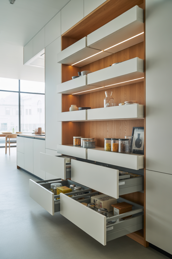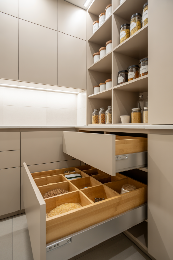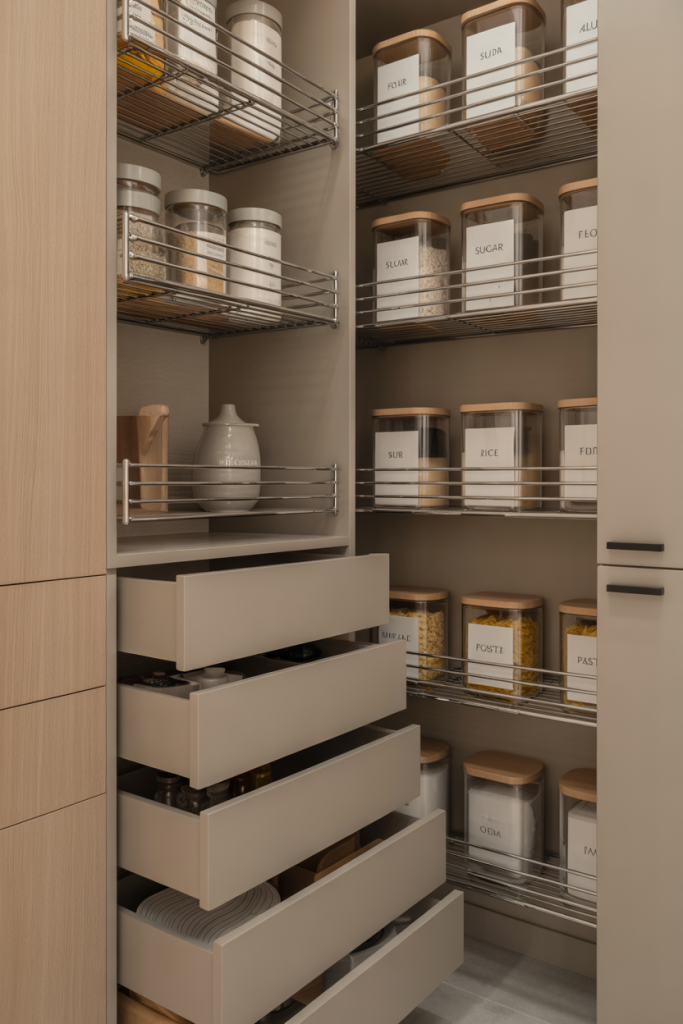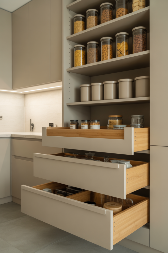 Pull out drawers have become essential in modern kitchen organization. They maximize storage depth and make every food item reachable. Pair sleek metal sliders with bamboo dividers for a balance of aesthetic and function. Ideal for small spaces, this design keeps your pantry neat without heavy renovation.