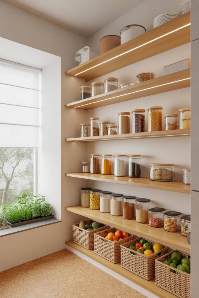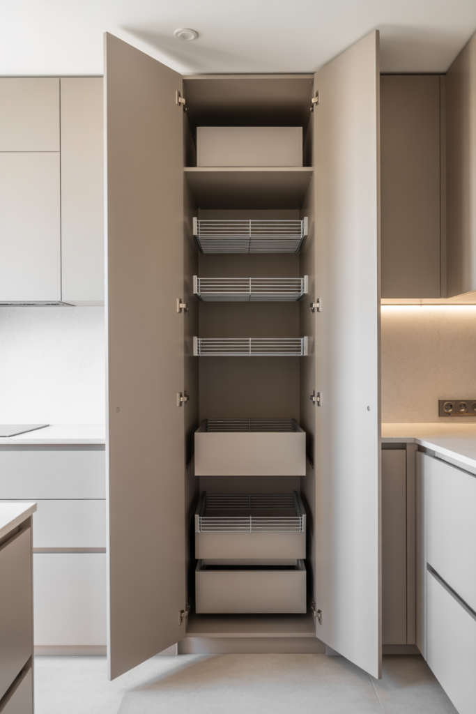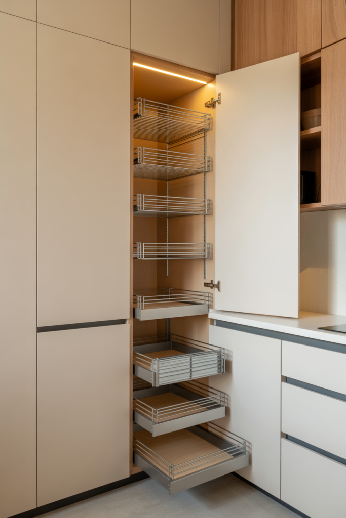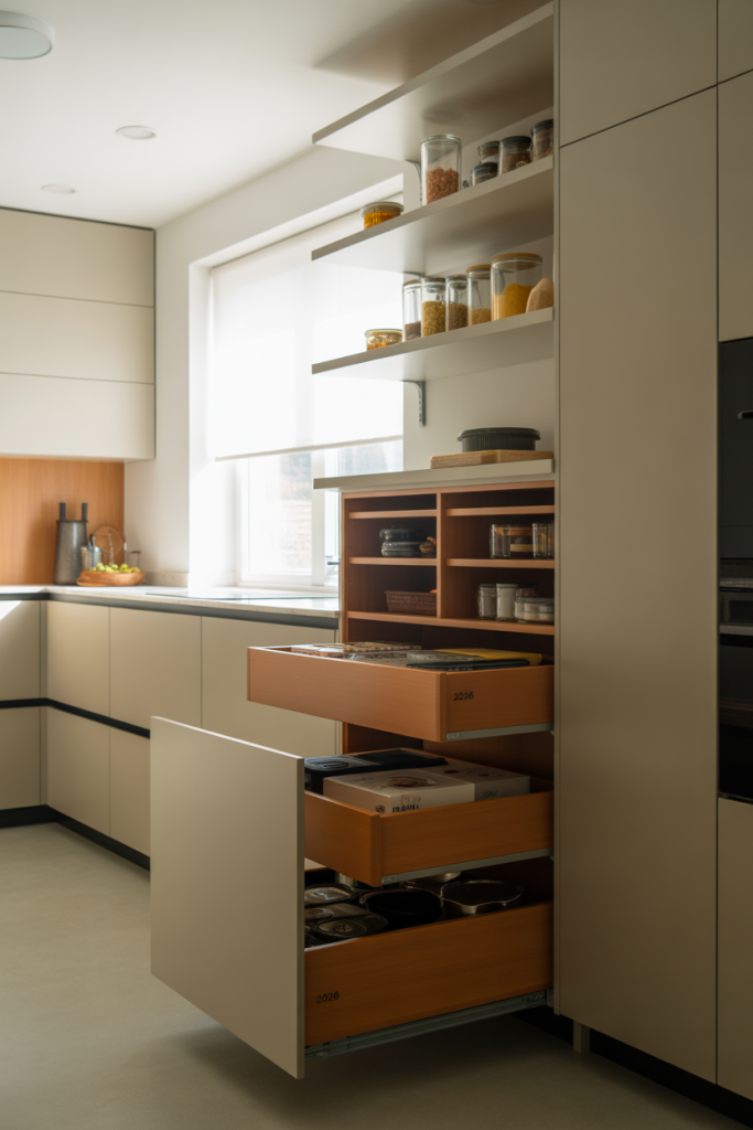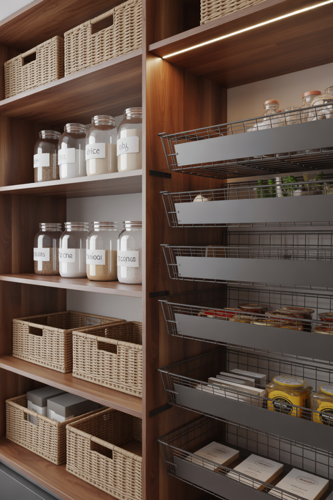 Pull out drawers have become essential in modern kitchen organization. They maximize storage depth and make every food item reachable. Pair sleek metal sliders with bamboo dividers for a balance of aesthetic and function. Ideal for small spaces, this design keeps your pantry neat without heavy renovation.