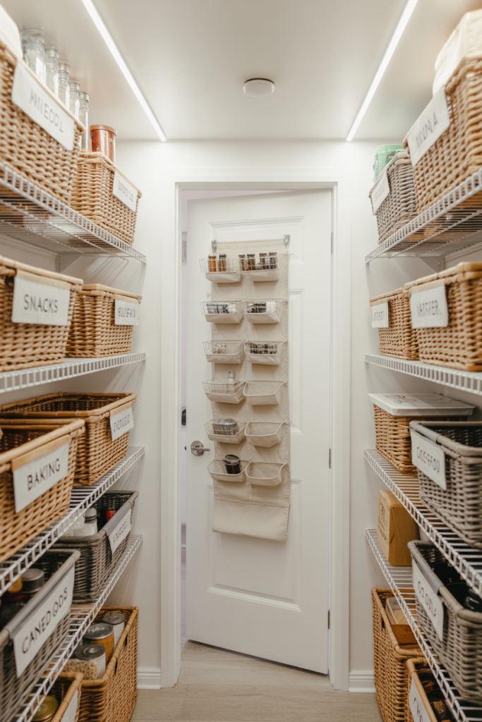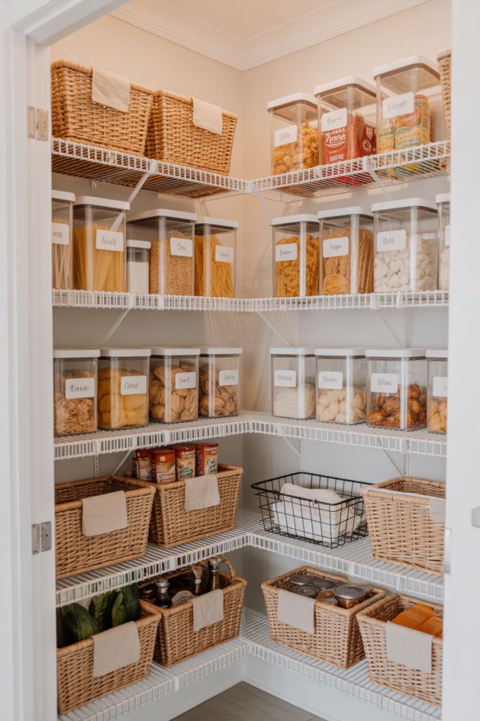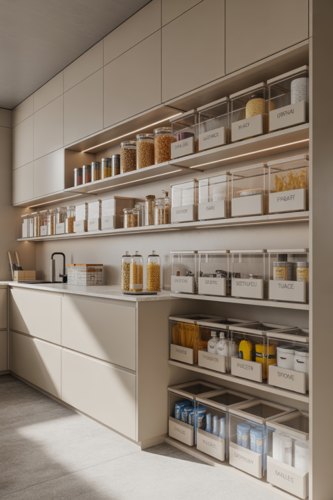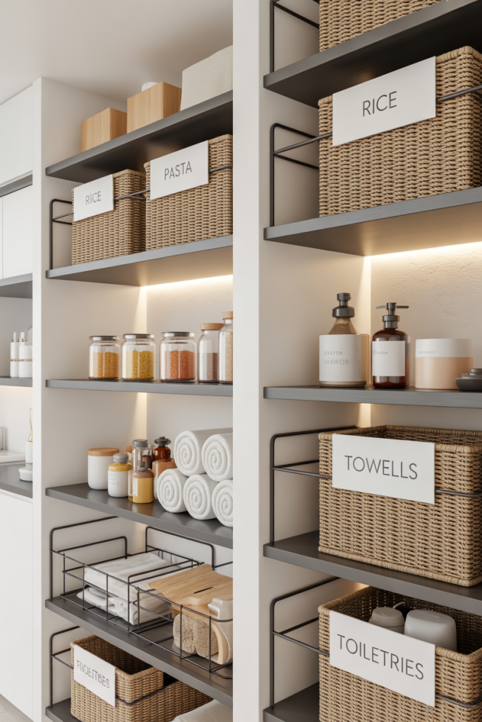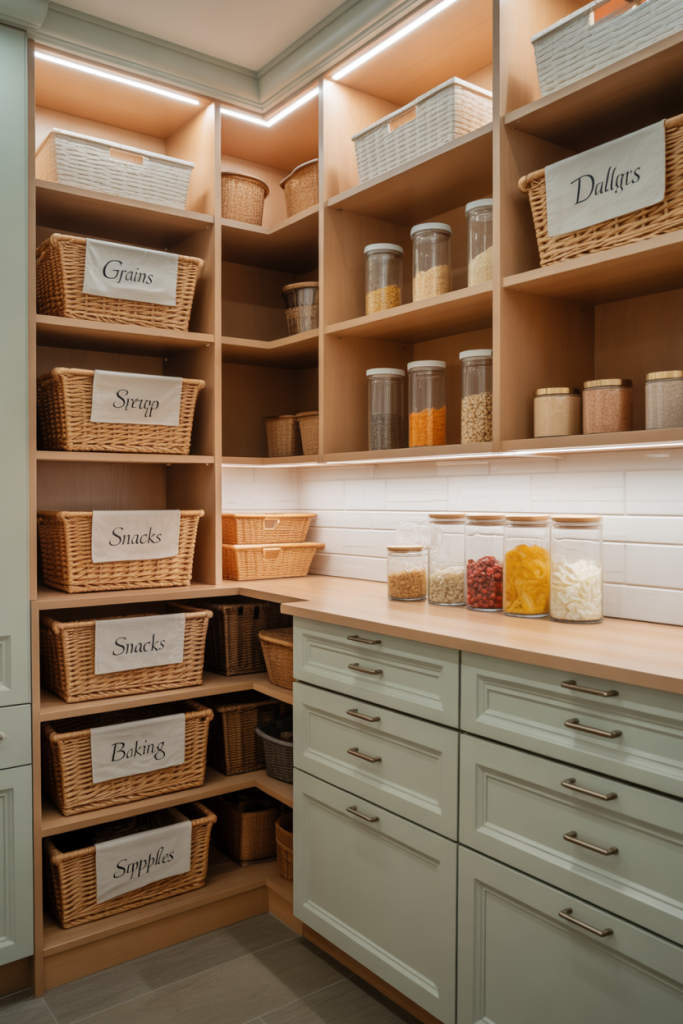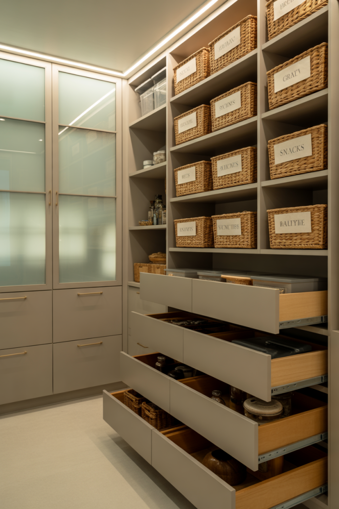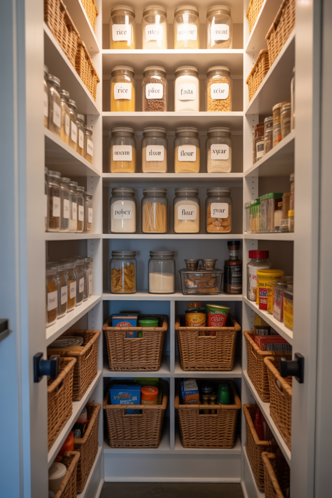 For those blessed with a large walk in pantry, zoning is key. Divide sections by food type-grains, baking, snacks, and cleaning. Add pull out drawers for hidden storage and baskets for produce. Keep things looking polished with matching containers and a neutral aesthetic.