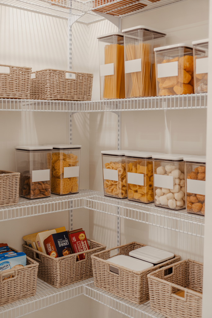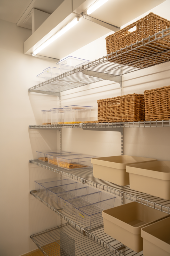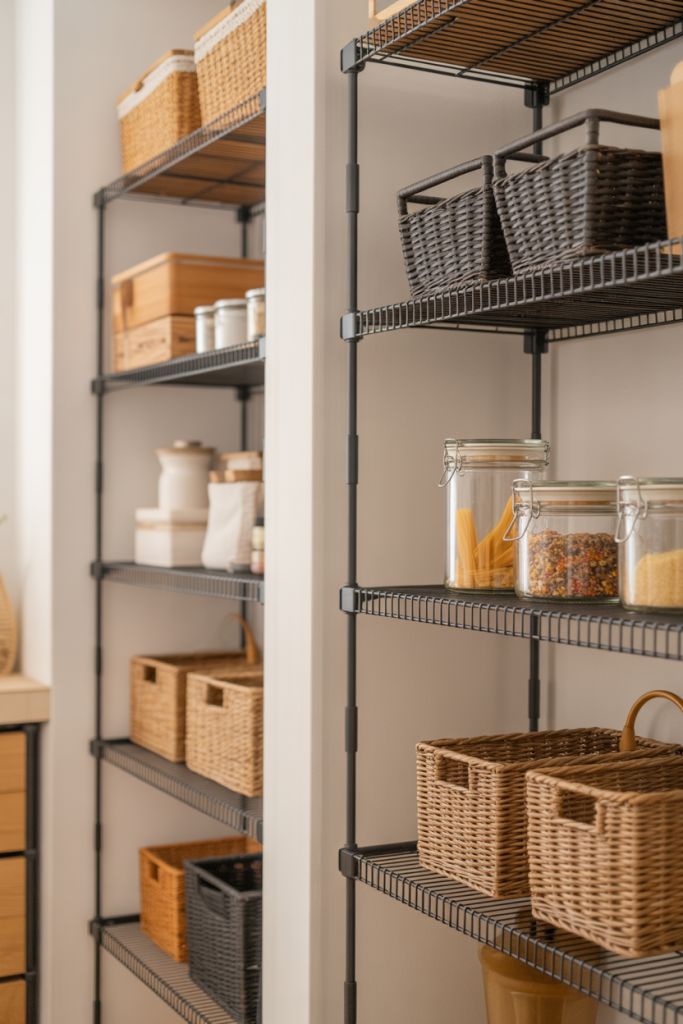 Sometimes the best pantry organization 2026 ideas are the simplest. Wire shelf systems are light, adjustable, and easy to install, making them ideal for renters or anyone on a budget. Add baskets for grouping and use Dollar Tree bins for dry food storage. The airy design keeps everything visible and breathable—perfect for humid climates.