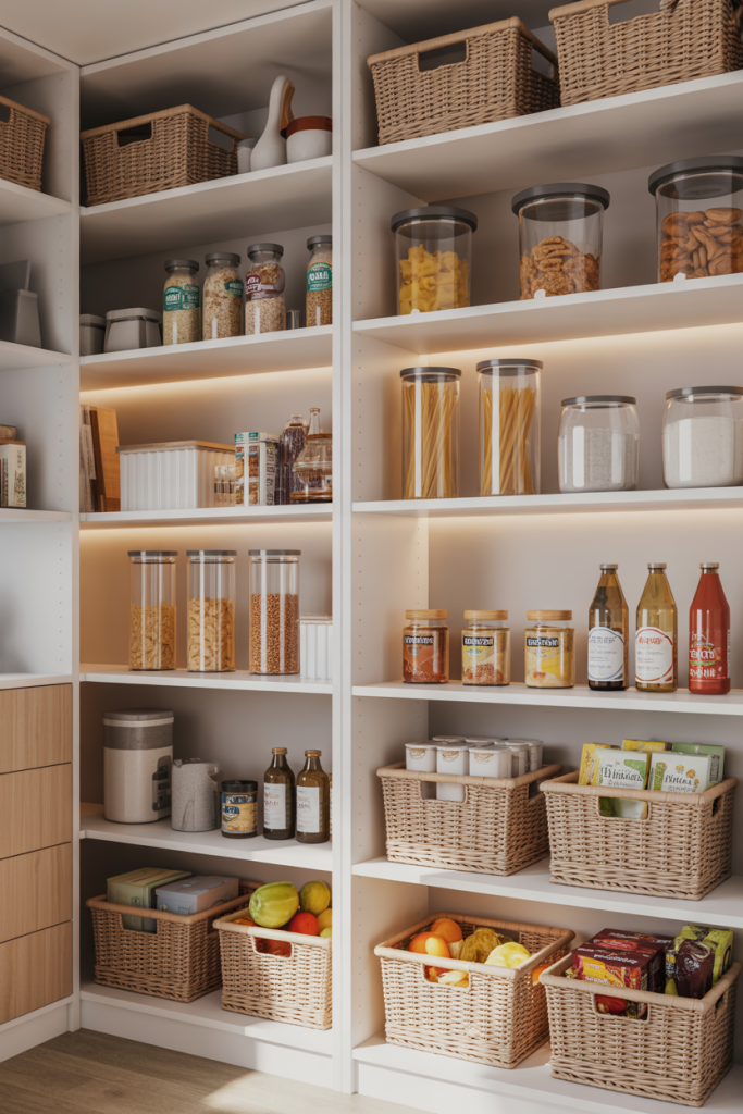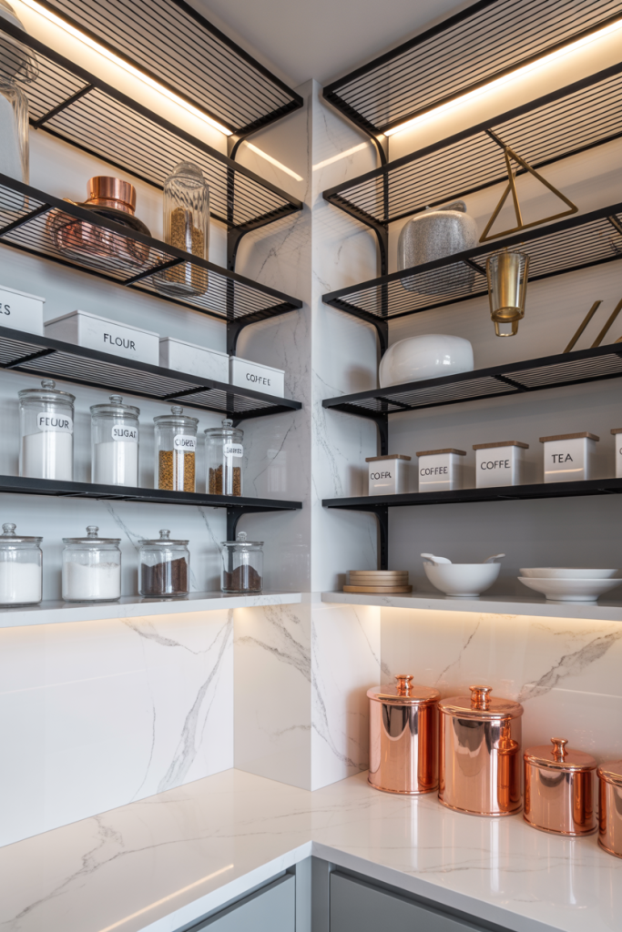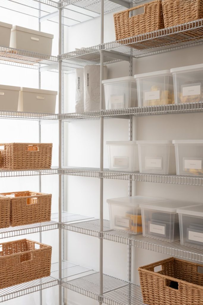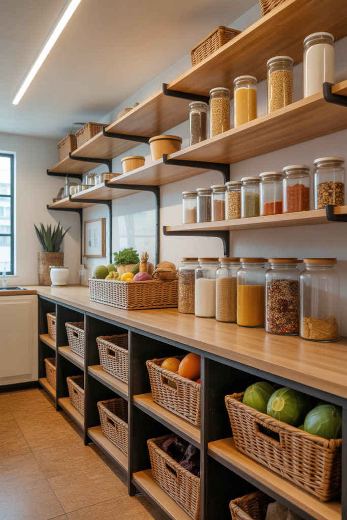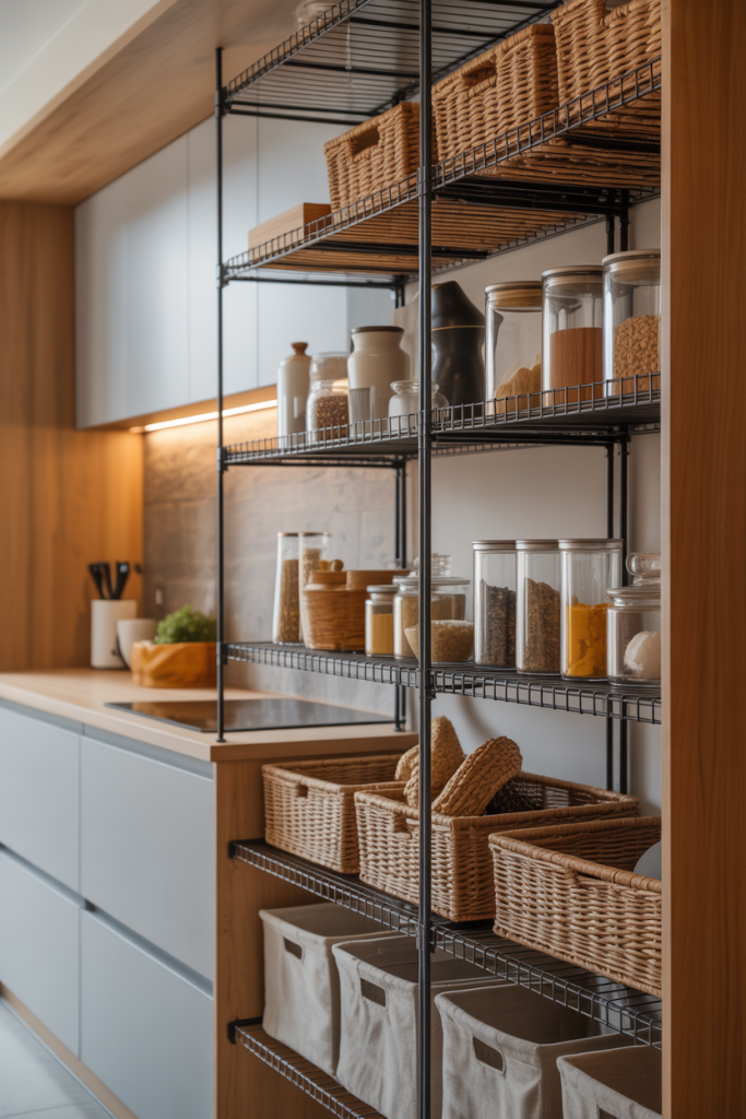 Embrace a light, breathable look with an open pantry layout that feels both modern and natural. Use wire shelf racks to keep airflow steady, baskets for fresh produce, and clear jars for dry food. Pair this with Ikea or Kmart storage pieces for a cohesive aesthetic that blends seamlessly into your kitchen. This style feels lived-in yet curated—ideal for anyone who values simplicity and freshness.