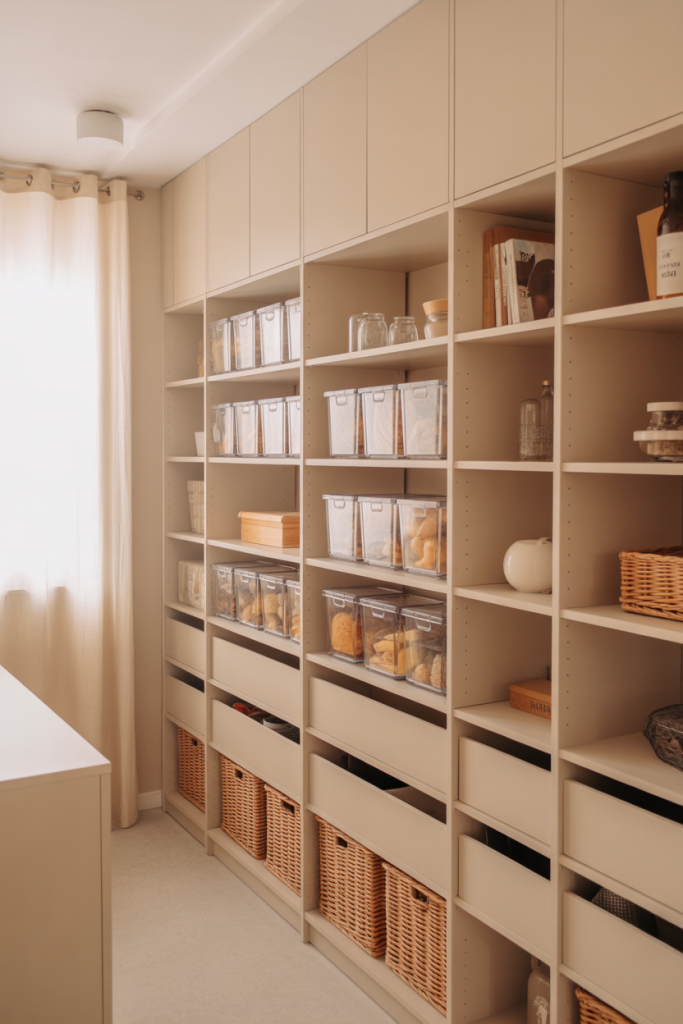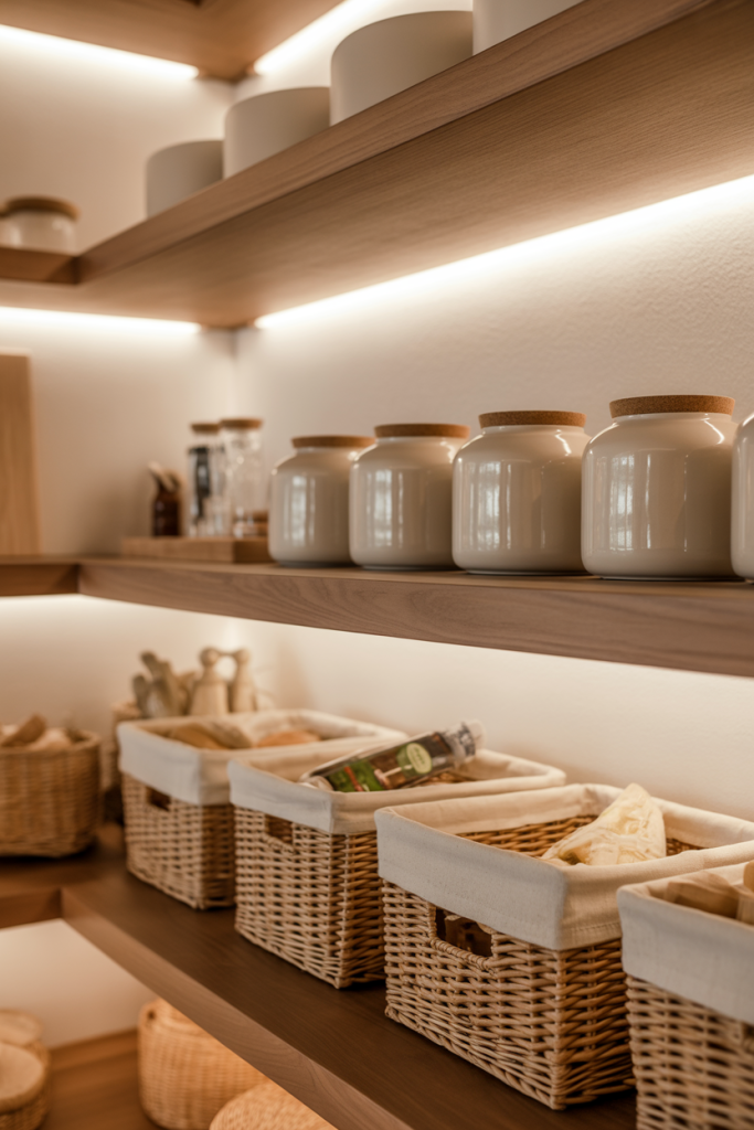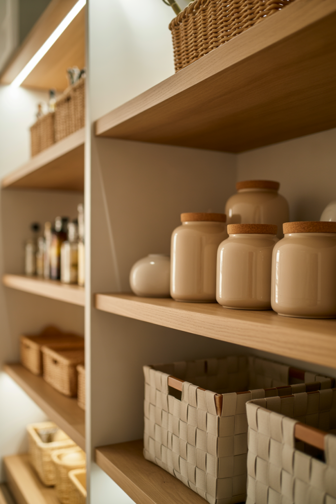 A soft neutral palette brings calm to your kitchen or walk in pantry. Choose beige jars, linen baskets, and light wood shelves that create a cozy, timeless feel. Inspired by design experts like The Home Edit, this aesthetic promotes peace and order while blending seamlessly with any interior.