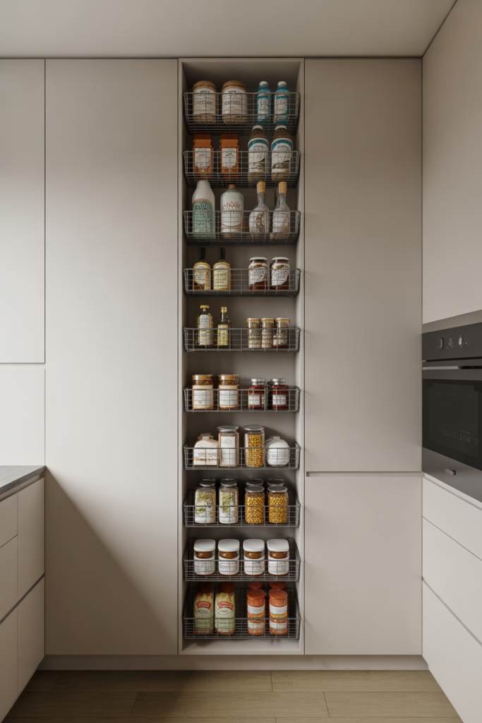 Create a concealed closet-style pantry using floor-to-ceiling cabinets. Perfect for narrow or small space kitchens, these pantries hide clutter while offering full accessibility. Install pull out drawers and adjustable wire shelf units for a seamless, minimalist look.