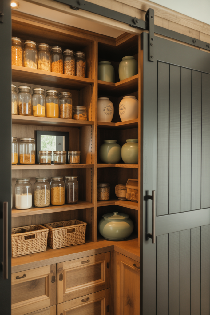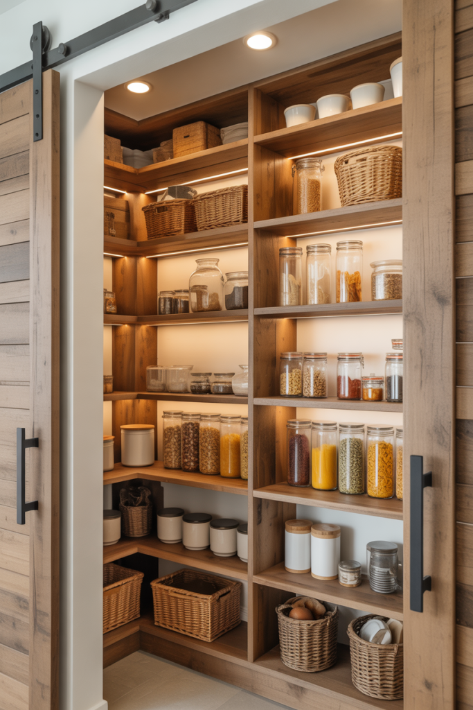 Bring rustic charm into the future with a farmhouse pantry that mixes open shelving and vintage-style jars. Add baskets for produce and pull out drawers for hidden storage. Kmart’s glass jars or Ikea’s natural wood finishes complete the cozy-meets-modern vibe.